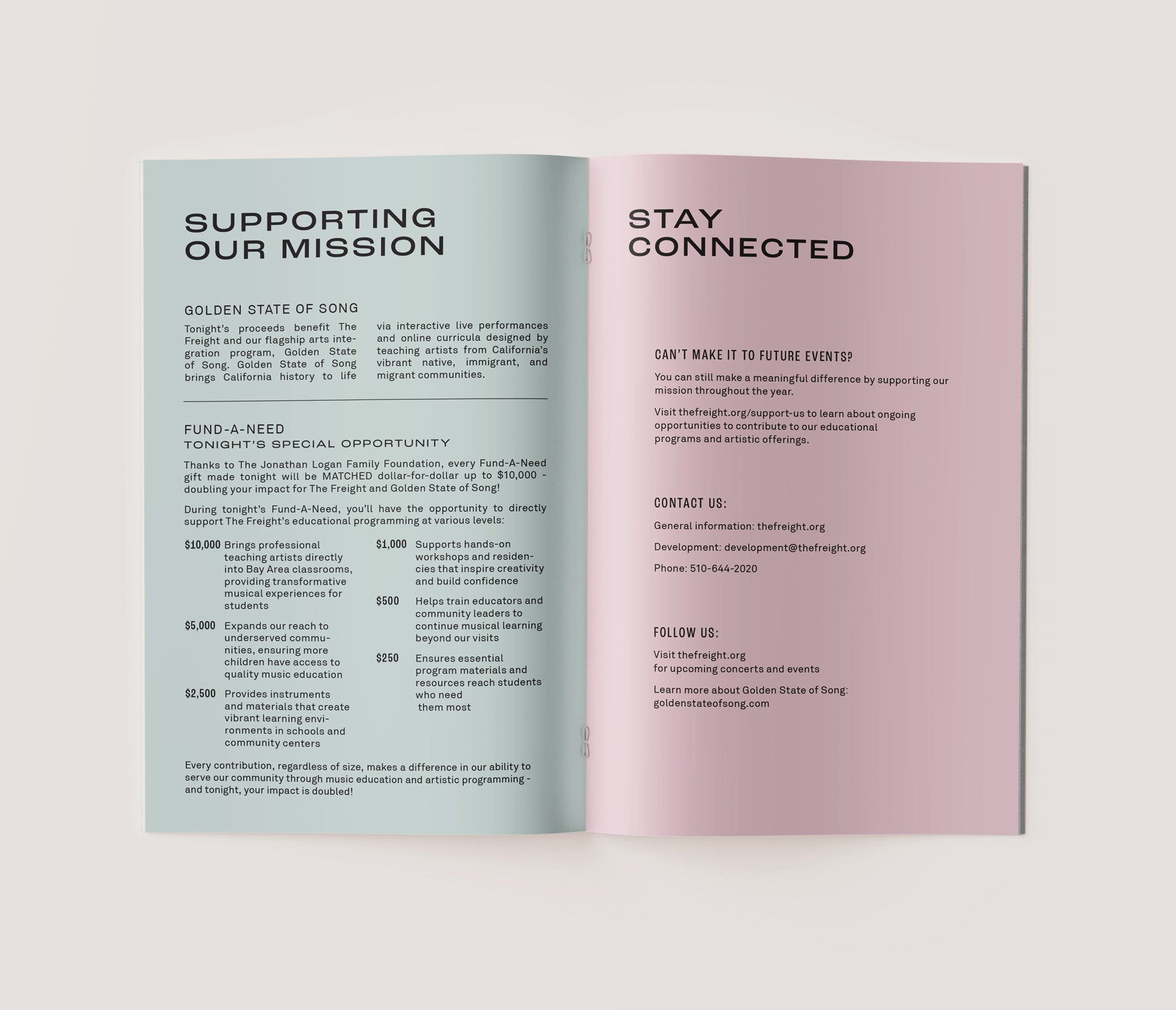 Print design for The Freight, founded in 1968 in Berkeley California as The Freight & Salvage. The Freight has become a world famous venue, and non-proifit for traditional music rooted in regional, ethnic, and social cultures of music worldwide. Our collaborations have included holiday cards, poster designs, event programs, and mailers that exceeded fundraising goals