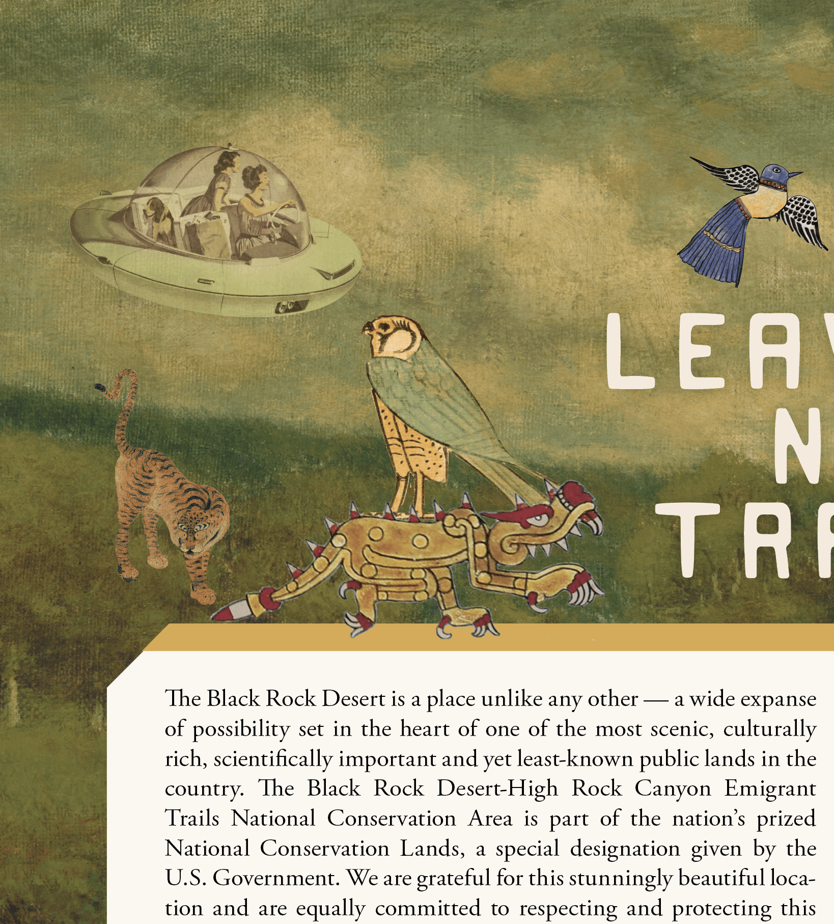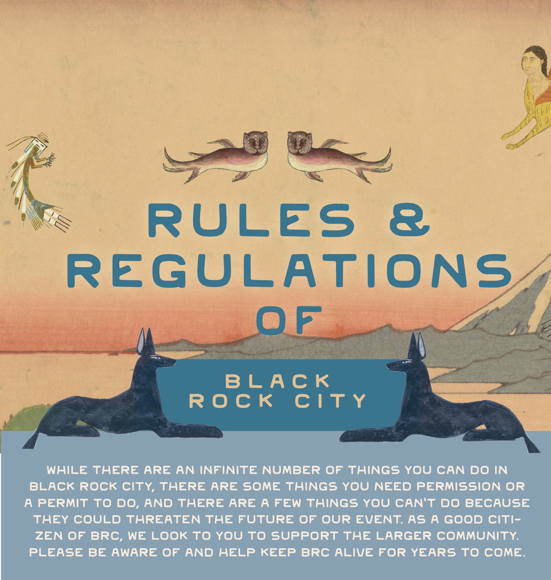 The wonderful folks at Burning Man saw my human-less, future-less designs and gently nudged me to at least acknowledge the theme for my 80,000 friends in Black Rock City – so hidden among collaged images of indigenous art including ancient weavings from Peru, panted hides from North American tribes, landscapes and mythical creatures from the Middle East and Asia, are tiny cosmonauts to usher in a hopeful age to illustrate my peaceful, creative, and diverse vision for the future.