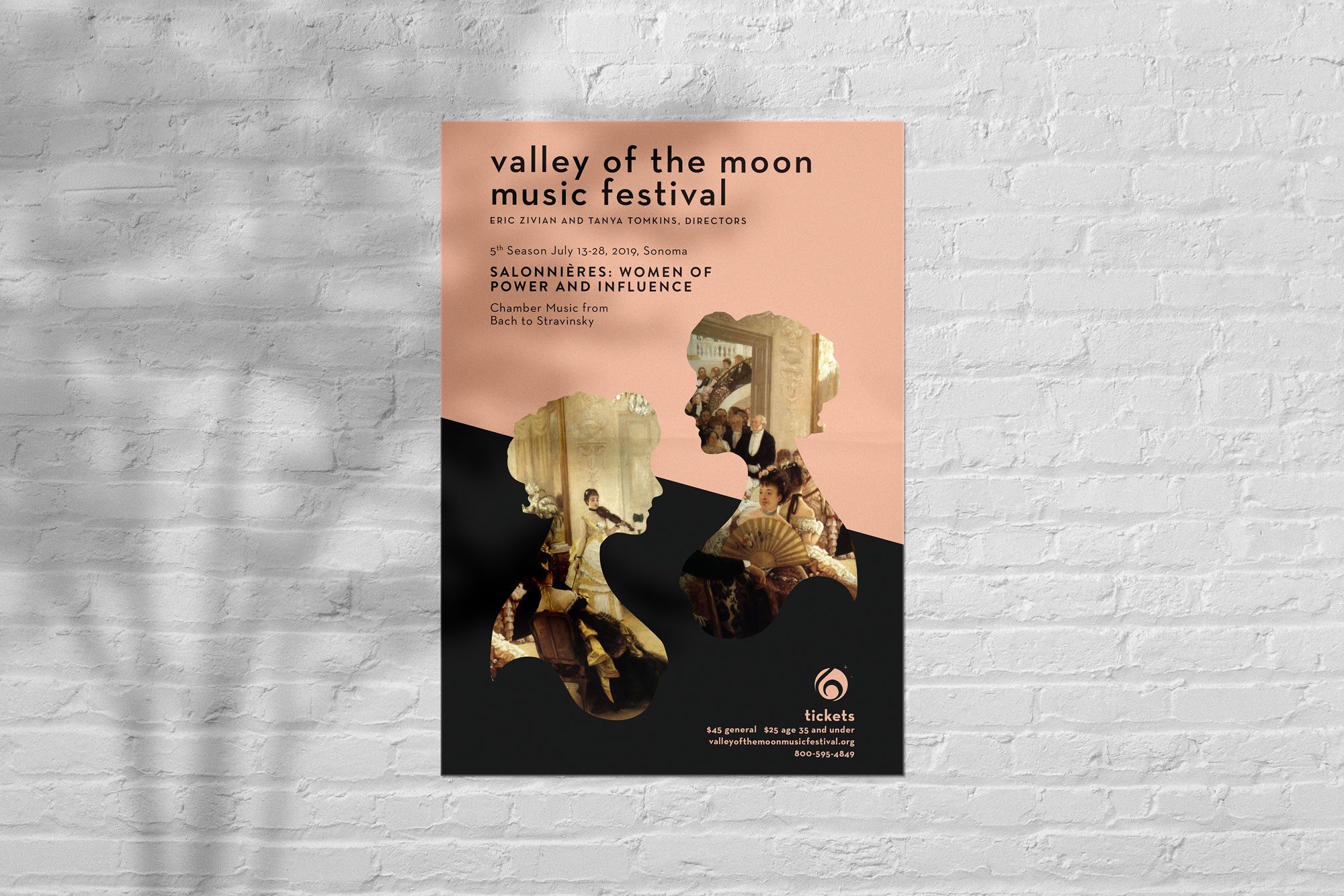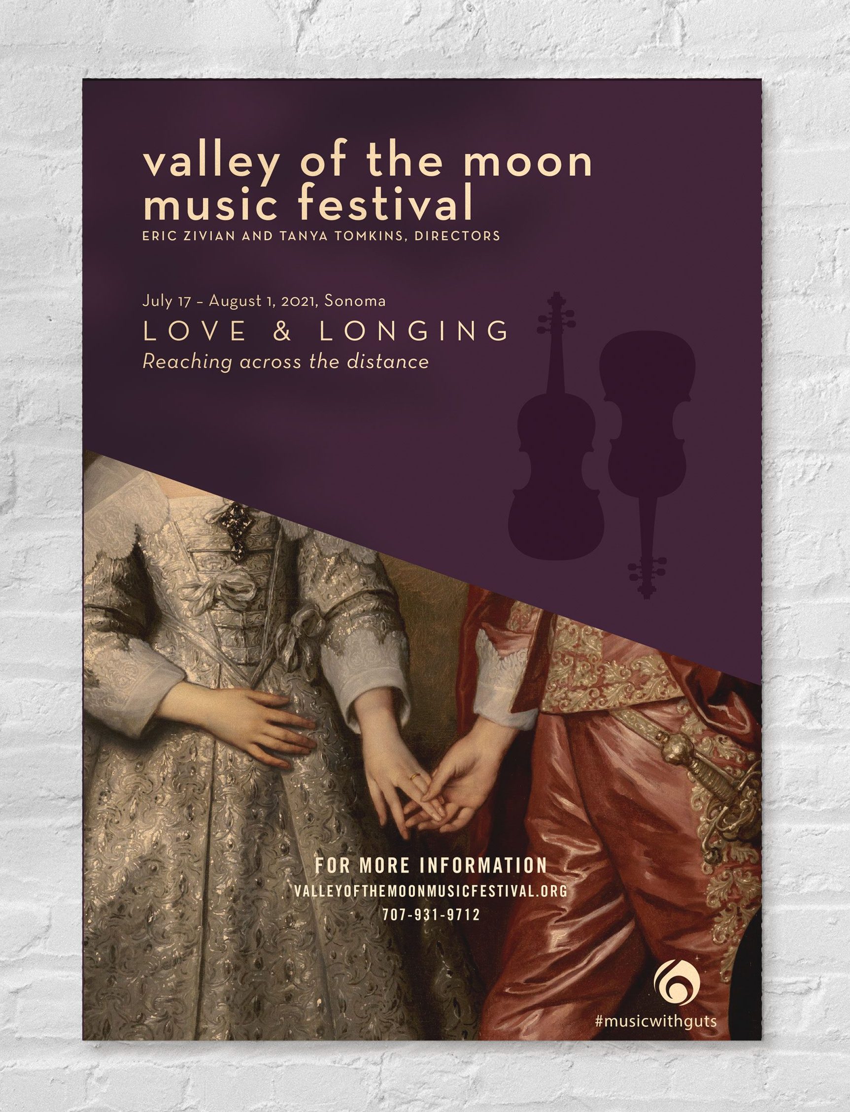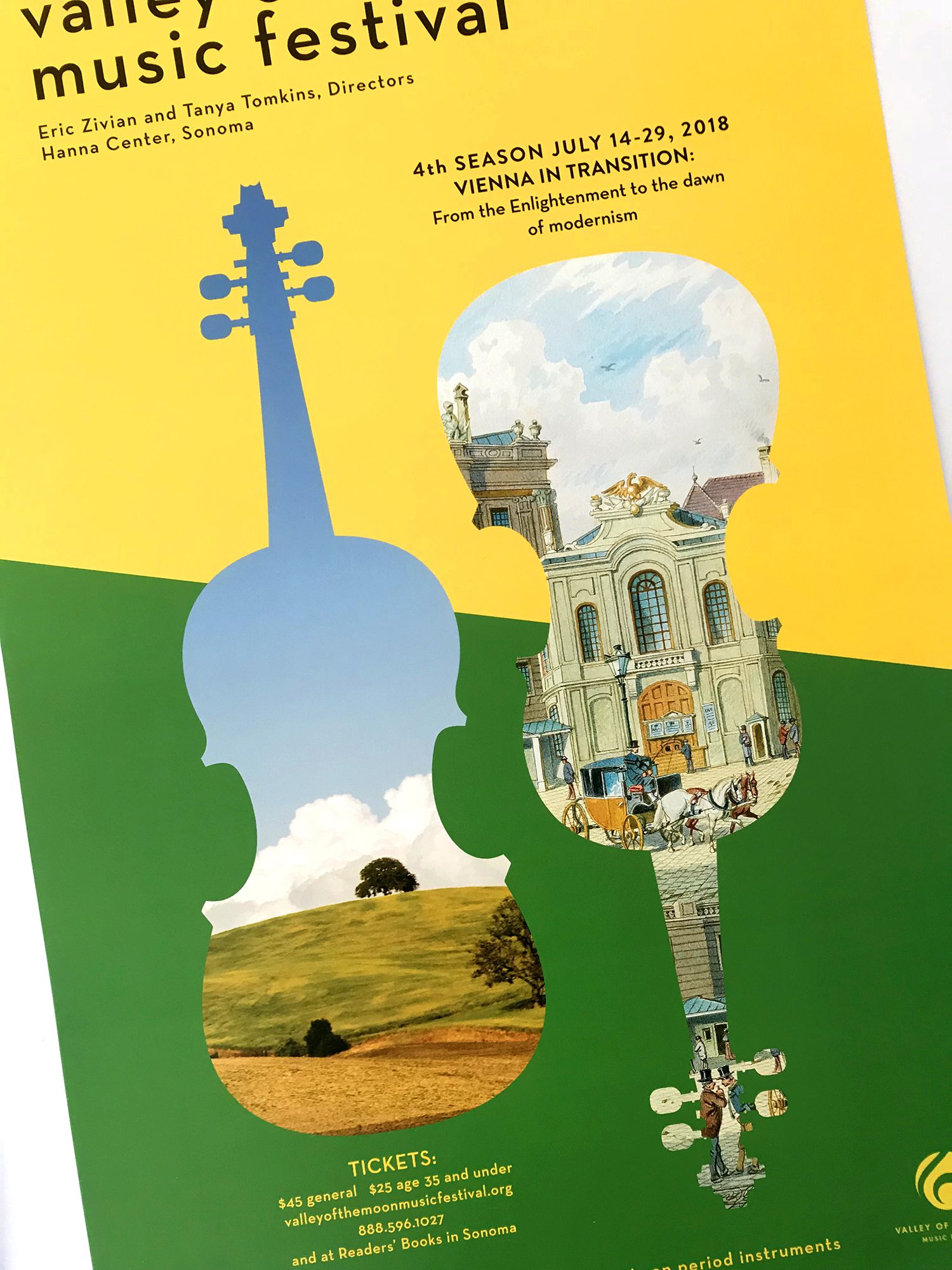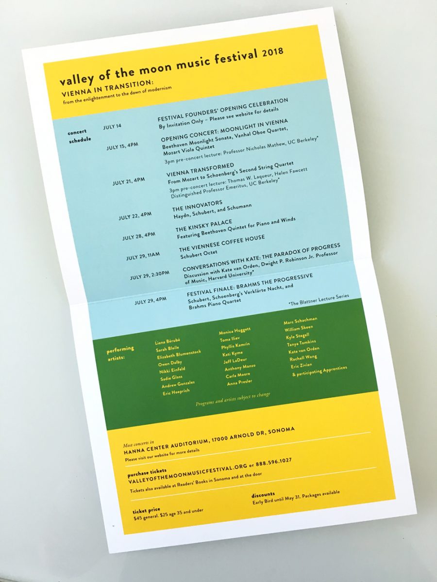 Valley of the Moon Music Festival is an annual event in Sonoma, California that performs classical music on period instruments. The event is a blend of the traditional and unexpected. The design successfully reflects that balance and reaches a younger audience without alienating its regulars. The solution to this design balances opposites in harmony.